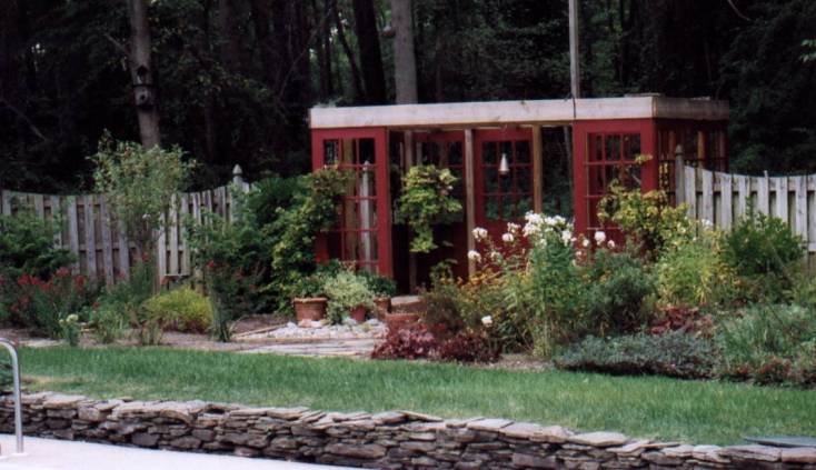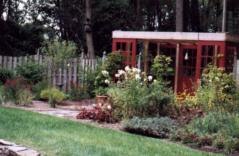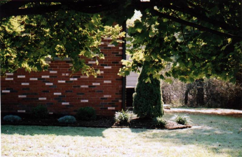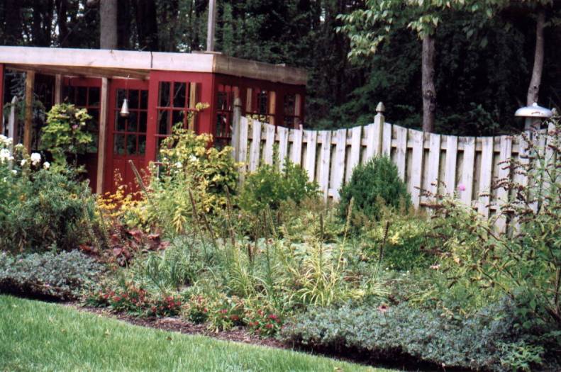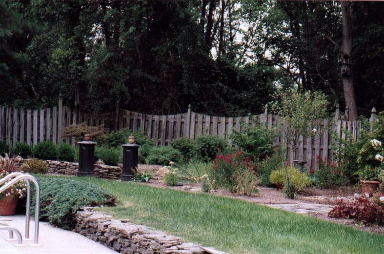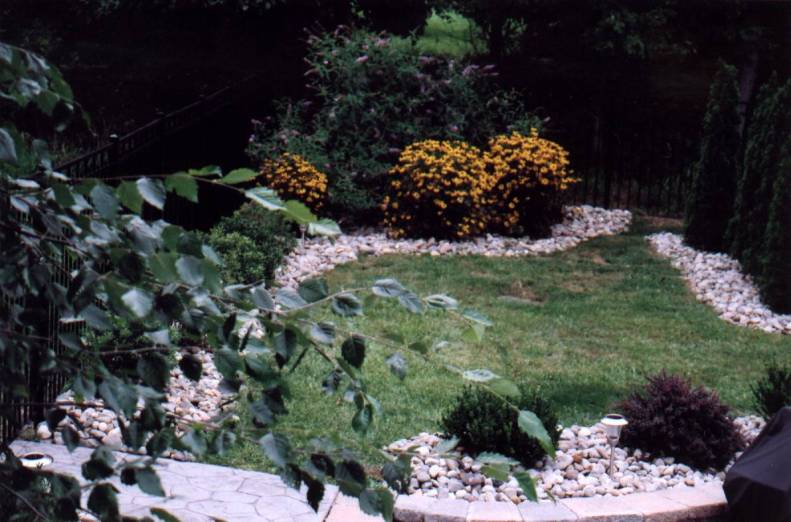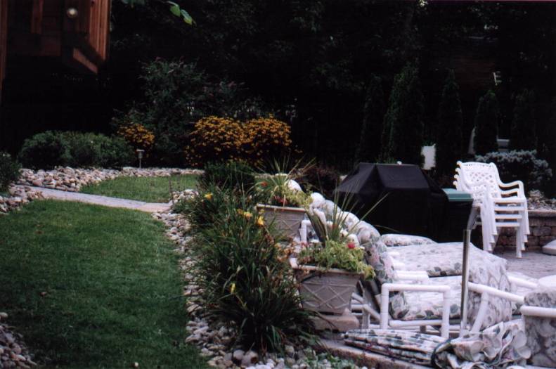 The greatest challenge many times is how to complement portions of an existing landscape that you want to keep when it's been decided updating is necessary. Clearly, installing very small plants next to mature stock can upset the balance, yet finding just the right larger plants can prove both time-consuming and expensive. Whatever your needs, if you'd like to sit down and share your thoughts or solicit ours, feel free to contact us anytime. Quite honestly, landscaping is by far our favorite aspect of all that we do in connection with Lawn Express and we therefore always look forward to new opportunities to put our creativity to work! Below are a few examples from jobs we've done, of both complete landscapes and smaller property enhancements: The above photo is from a pool area with an existing mature perennial bed that the owners wished to complement with additional beds when creating the structure pictured. These new beds featured a mix of additional perennials, evergreen shrubs and ornamental deciduous trees to create a full spectrum of color and texture. The area on the right shows the mature bed already in place; the center and left represent new plantings.