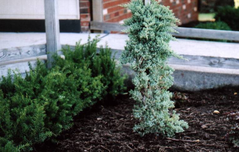 However, that restriction doesn't have to impair creativity, as evidenced by use of such interesting exotics as this Green Mountain Juniper (backed by Yews)...