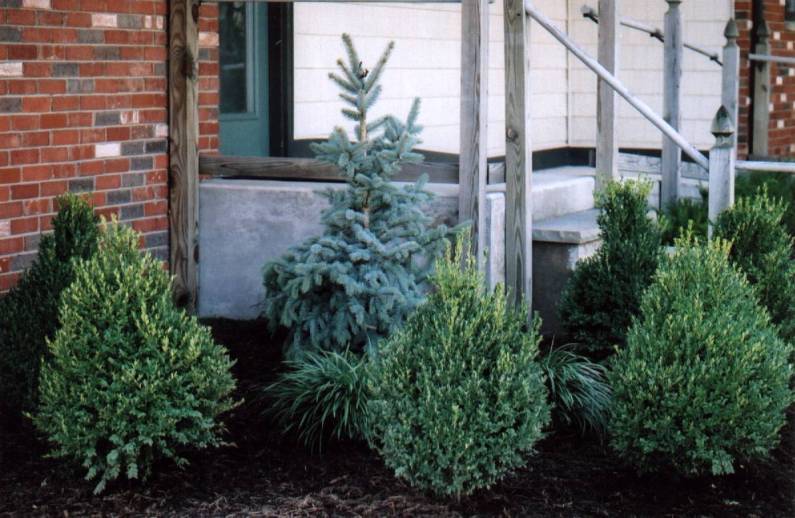 ...and a lovely Baccheri Spruce (surrounded by hearty and attractive pyramidal Boxwoods)...