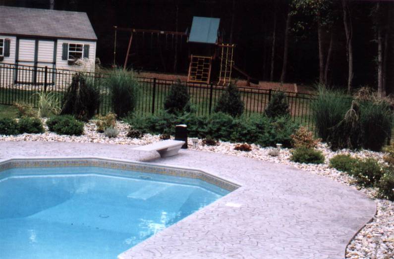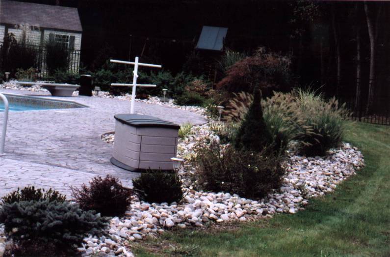 Next we have another pool area landscape, this one installed "from scratch", immediately following the pool and surrounding patio's construction...the following photos show various portions of this very large area (we will update with an overview at some point down the road -- unfortunately, we don't have any such photos at this time). Again, a mix of perennials and shrubs were combined with lawn areas to create diversity...