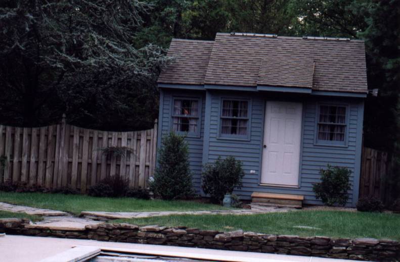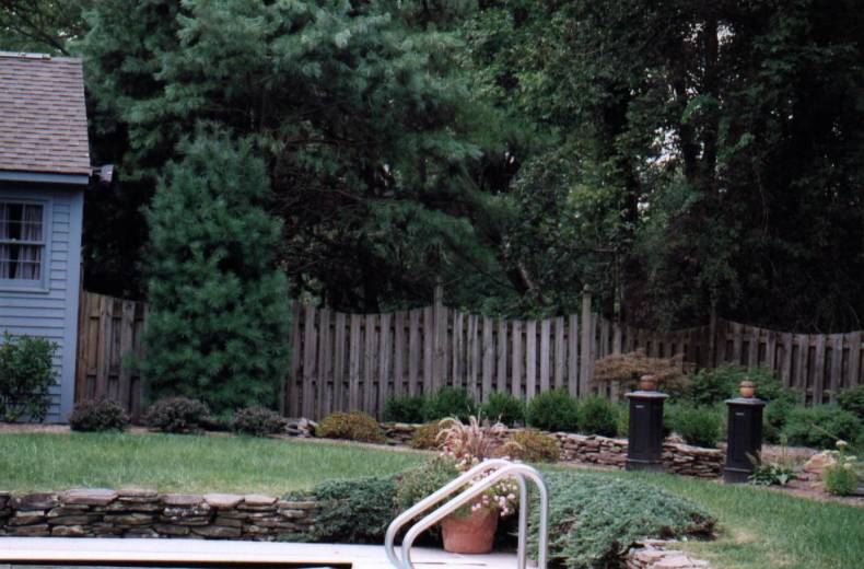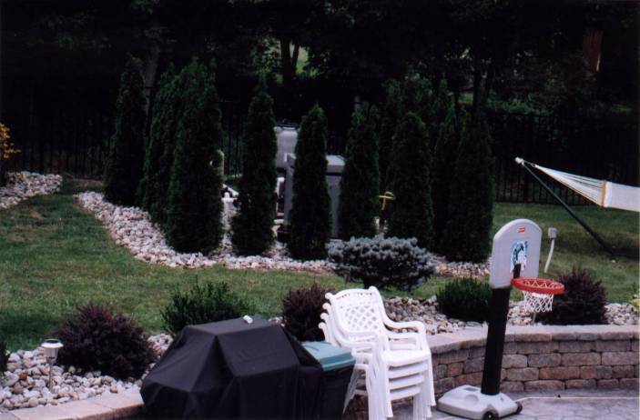 And, to aid in preserving the appearance of a natural environment, a screen of Arborvitae was installed to hide the pool filter and controls (keep in mind this photo was taken soon after planting; in just a couple years, these will form a solid wall)...